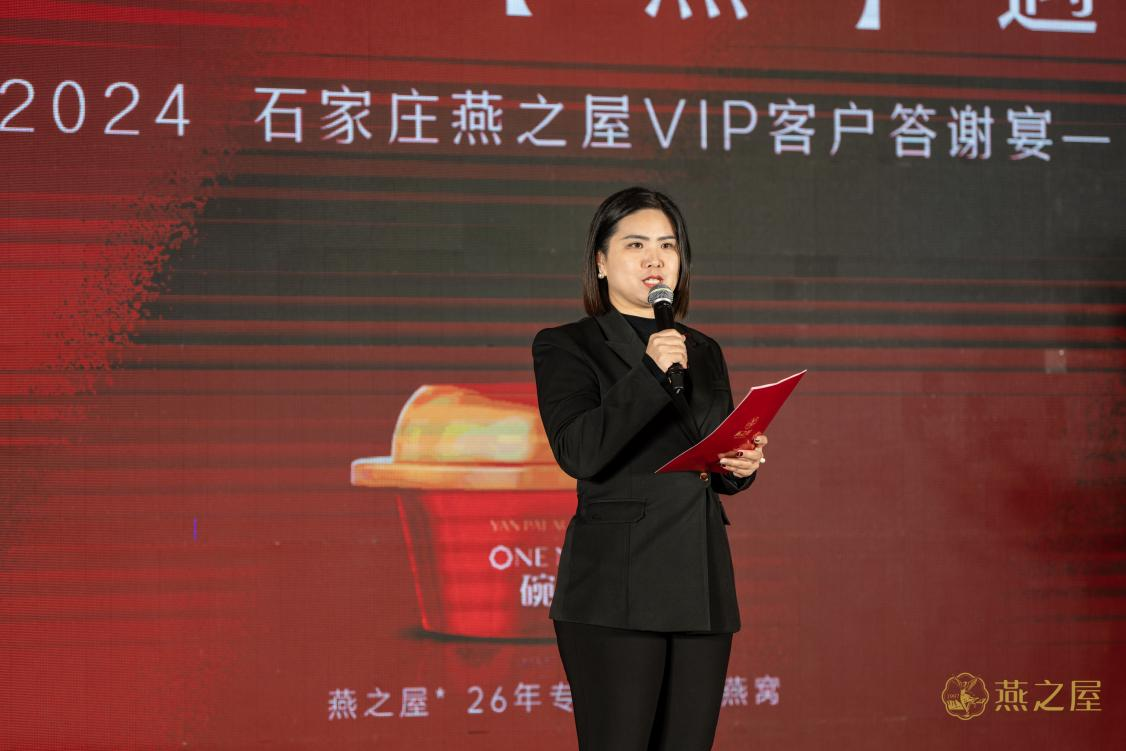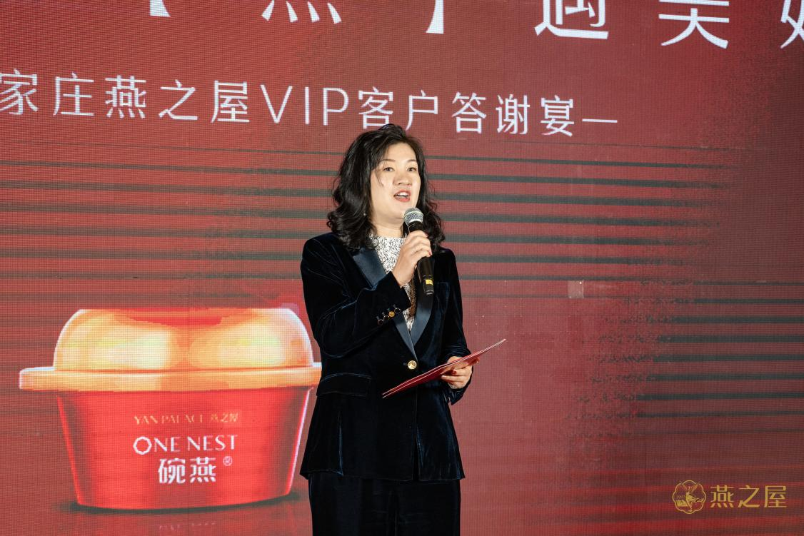 在熱烈的掌聲中,燕之屋石家莊合作商、河北法桐商貿(mào)有限公司總經(jīng)理趙寧上臺致辭,她說道:“在這個(gè)特殊的場合,我想表達(dá)我們對每一位貴賓的深深感激。正是因?yàn)橛辛四闹С?,才有了今年燕之屋在香港的上市(股票代碼:01497.HK)。今年是燕之屋企業(yè)成立的26周年,26個(gè)寒暑走過,我們初心不改,終于讓燕之屋成為了家喻戶曉的高端燕窩品牌,用品質(zhì)和服務(wù)征服了數(shù)以萬計(jì)的客戶。”她與在座貴賓共同舉杯敬酒,向各位賓朋致以由衷謝意。