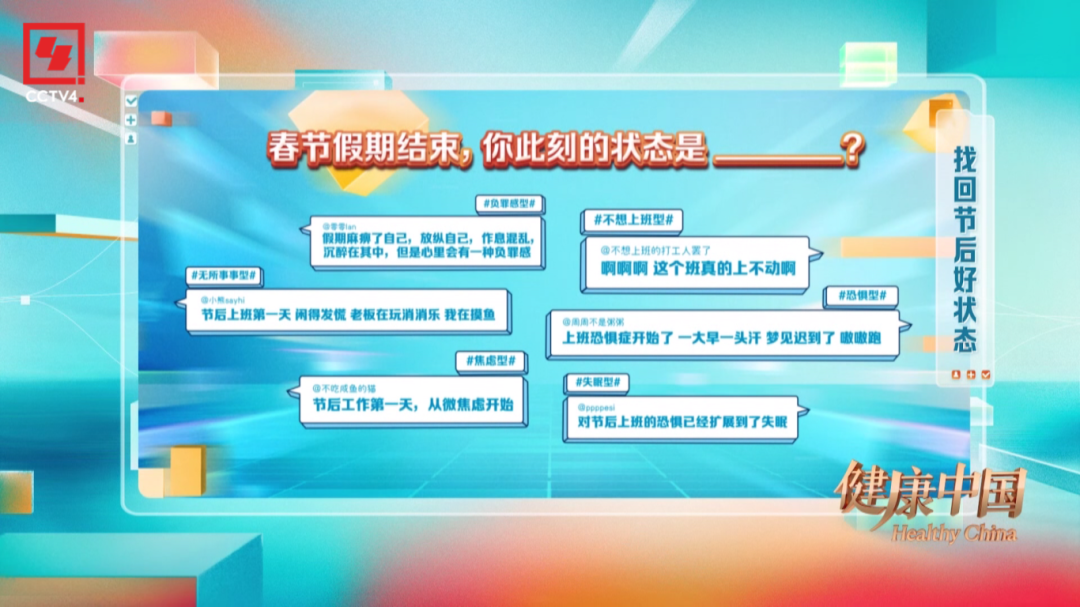 本期《健康中國(guó)》邀請(qǐng)到三組頗具特色的嘉賓。第一組嘉賓張曉彤和他的朋友劉睿文,一位是體育愛(ài)好者,一位是上班族。愉快的假期過(guò)后,劉睿文卻在節(jié)后第一天提不起精神,面對(duì)身體出現(xiàn)的不適感,讓她無(wú)所適從,節(jié)目中專(zhuān)家在線支招。