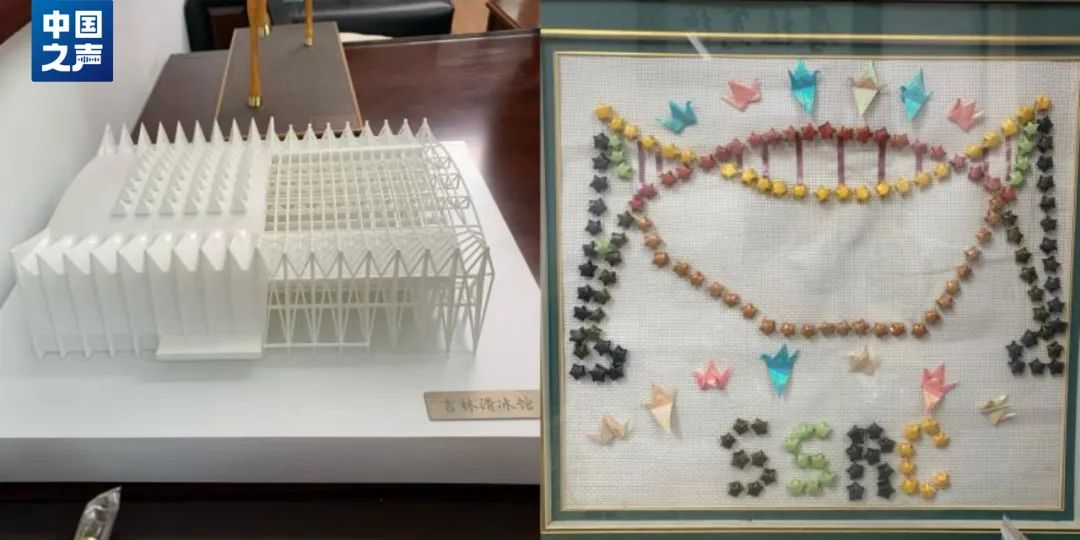 沈世釗的辦公室,一幅手工作品被放在門(mén)口最顯眼的位置,那是學(xué)生送給他的禮物。千紙鶴和紙星星拼貼成的雙向拋物線造型圖,定格了回國(guó)后的沈世釗在新領(lǐng)域白手起家的開(kāi)端:參與吉林省滑冰館的設(shè)計(jì)。