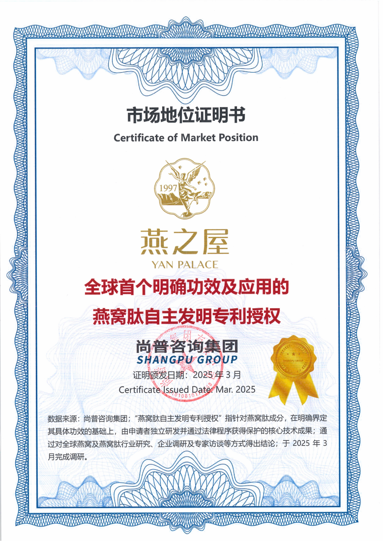 燕之屋多年來致力于燕窩肽研發(fā)與應(yīng)用,于2022年正式成立燕窩肽研究中心,開辟品牌在燕窩肽酶解技術(shù)、活性成分與功能研究的新賽道,多項(xiàng)研究成果刊登于國(guó)際權(quán)威期刊。2024年,燕之屋自主研發(fā)的“一種具有促進(jìn)細(xì)胞修復(fù)、高保濕美白功效的燕窩肽制備方法及應(yīng)用”榮獲國(guó)家知識(shí)產(chǎn)權(quán)局授權(quán)發(fā)明專利⑥。經(jīng)權(quán)威機(jī)構(gòu)尚普咨詢集團(tuán)專業(yè)認(rèn)證,燕之屋更獲得“全球首個(gè)明確功效及應(yīng)用的燕窩肽自主發(fā)明專利授權(quán)”④市場(chǎng)地位證明書,進(jìn)一步驗(yàn)證該專利的引領(lǐng)地位,夯實(shí)燕之屋在燕窩肽技術(shù)領(lǐng)域的引領(lǐng)者身份。